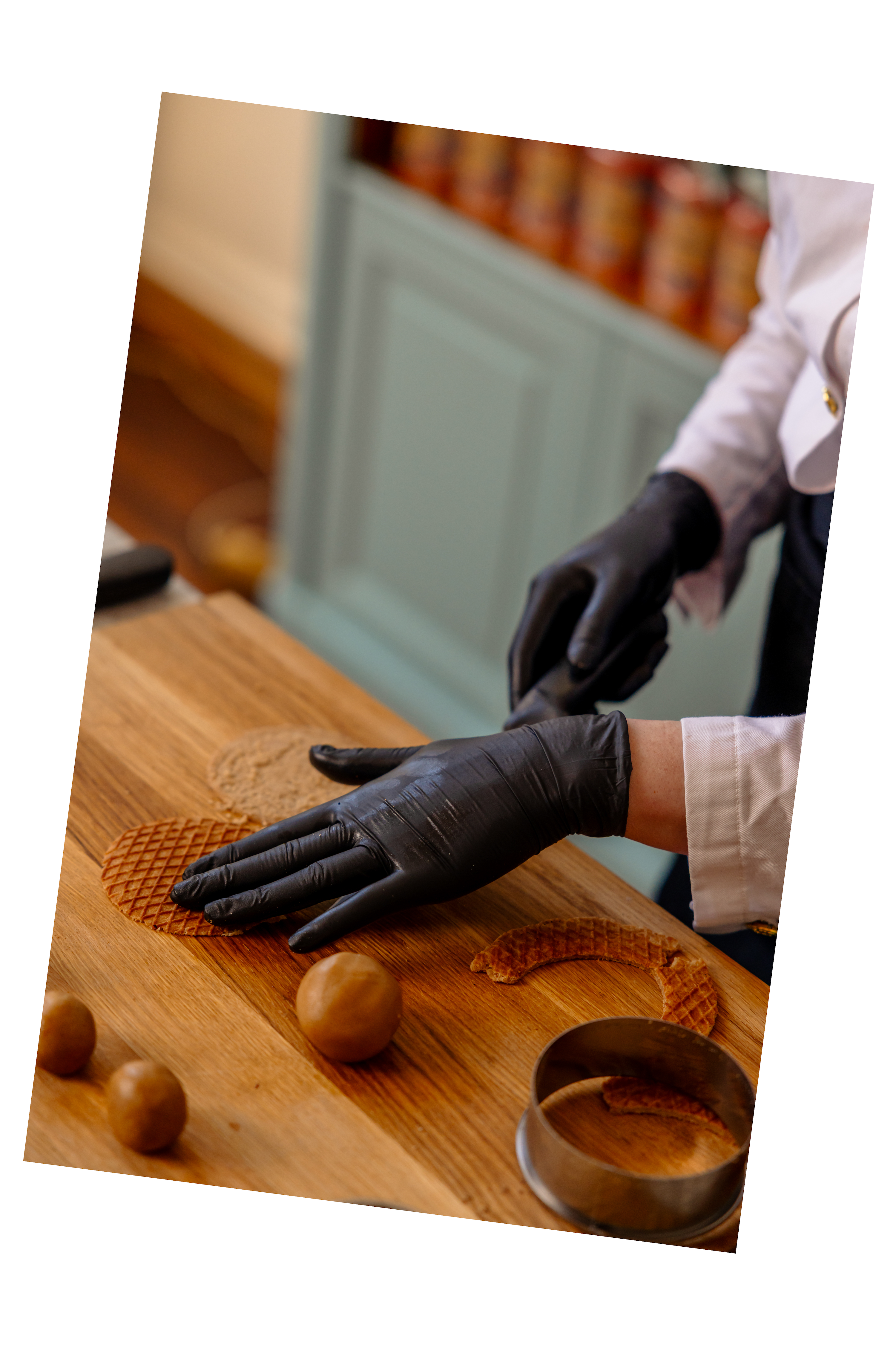 Fresh from the iron, each waffle is carefully trimmed by hand into a perfect circle — warm, golden, and ready for the next step. The outer edges are gently removed to reveal a smooth, even surface that’s just right for filling.