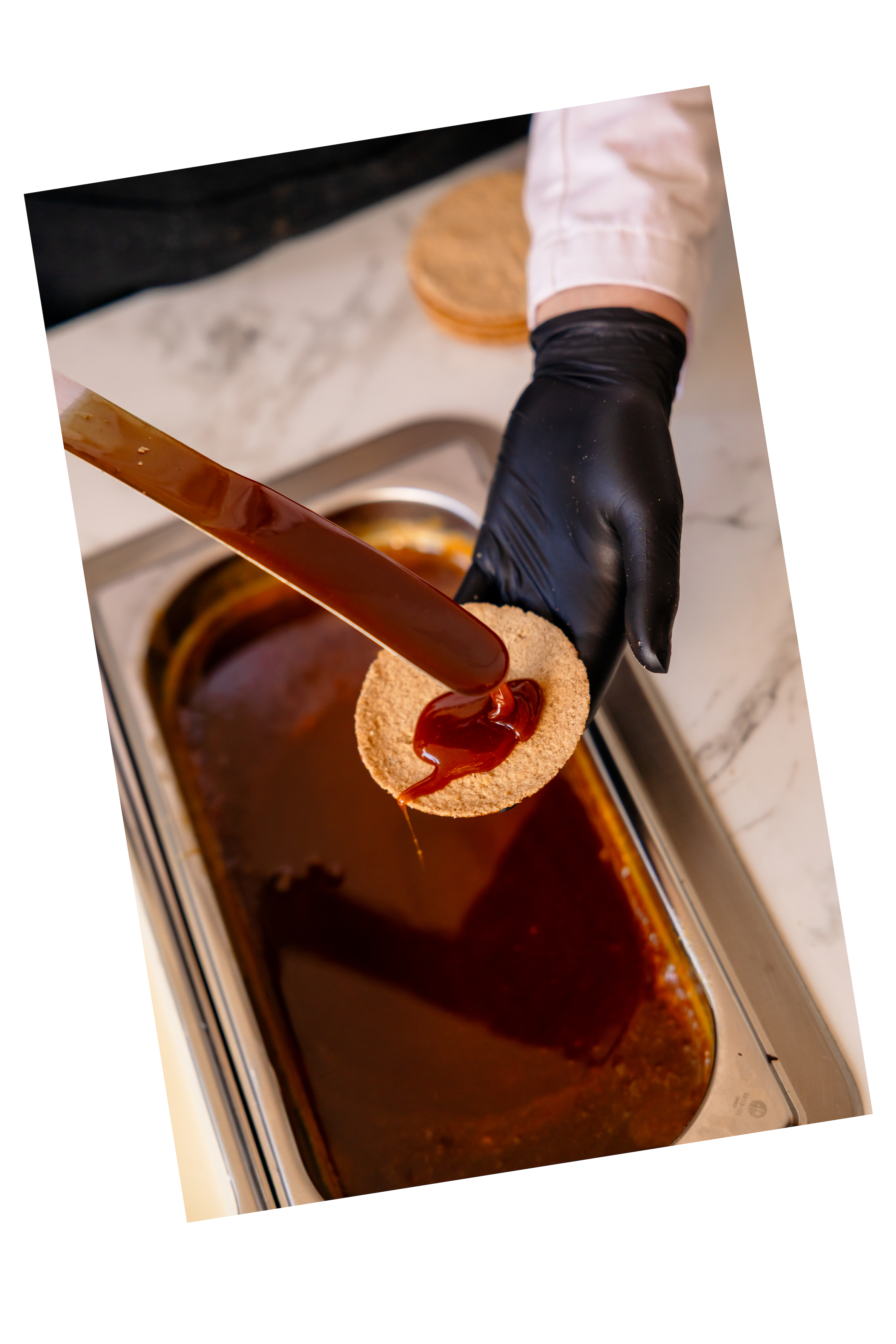 Still warm and silky, the caramel seeps into every groove, creating that perfect chewy texture we’re known for. One half gets the golden layer… the other seals the deal.